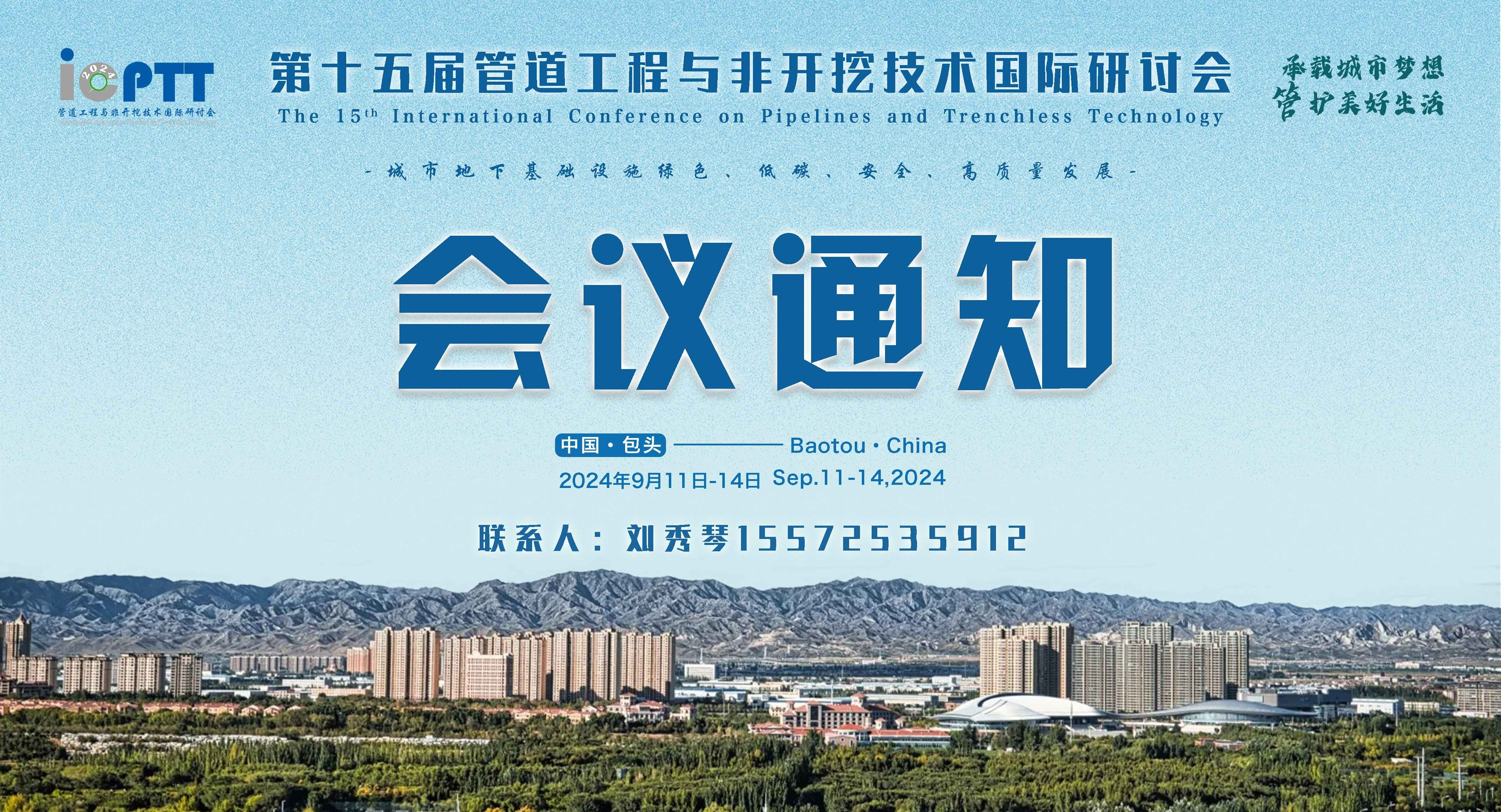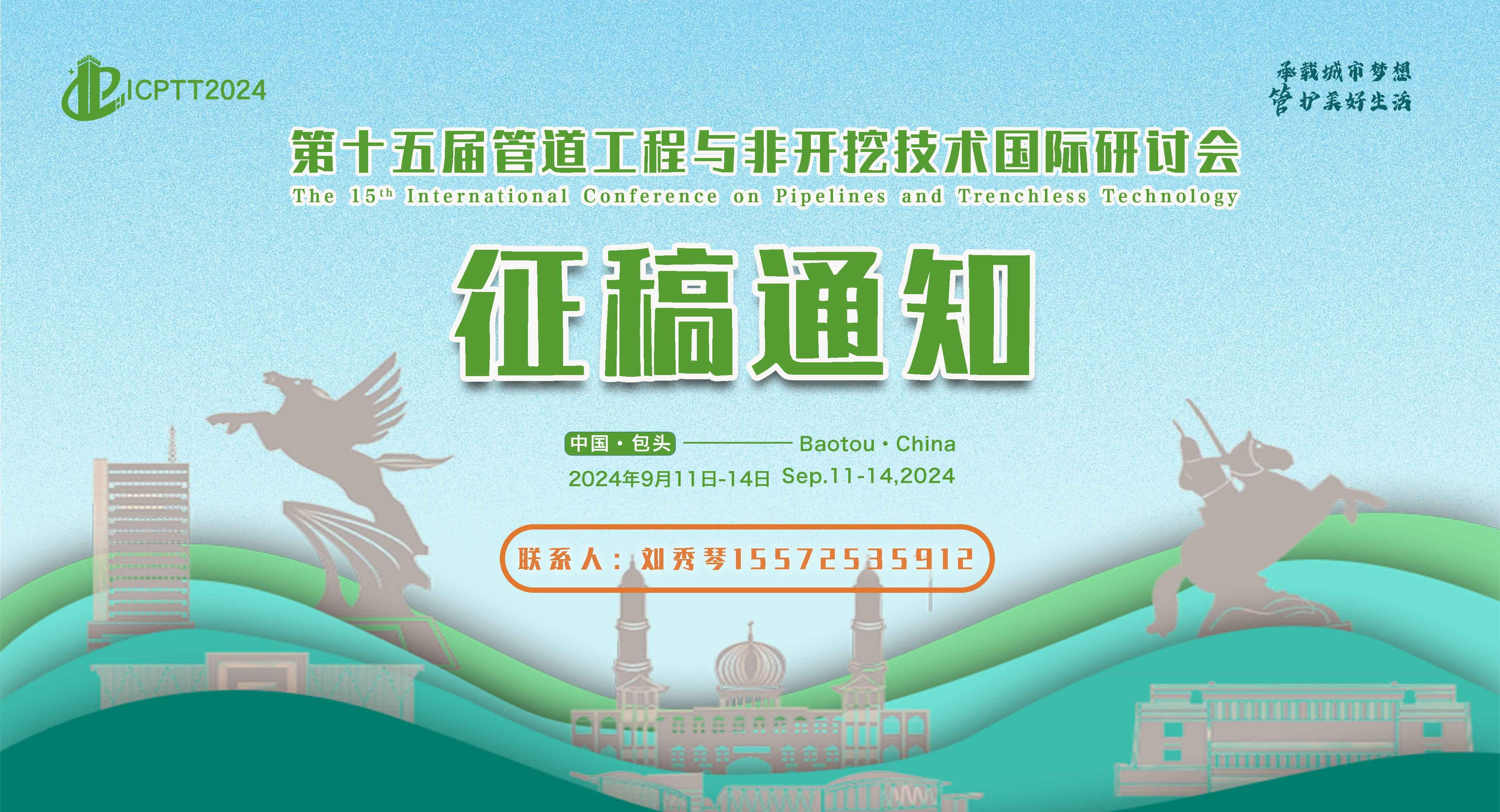 關于召開“第十五屆管道工程與非開挖技術國際研討會(ICPTT2024)”的通知 各有關單位: 為了持續更好地推動管道工程和非開挖技術領域創新性科研成果、新技術和先進工程經驗的探討、交流和復雜問題的協同研究,促進管道與非開挖工程領域政、產、學、研、用的共同進步,快速提高管道建設水平,服務于我國城市地下管線基礎設施建設與更新改造,中山大學、內蒙古科技大學、同濟大學、鄭州大學、中國地質大學(武漢)、長江生態環保集團有限公司、壩道工程醫院等單位將于2024年9月11-14日在中國包頭市共同組織